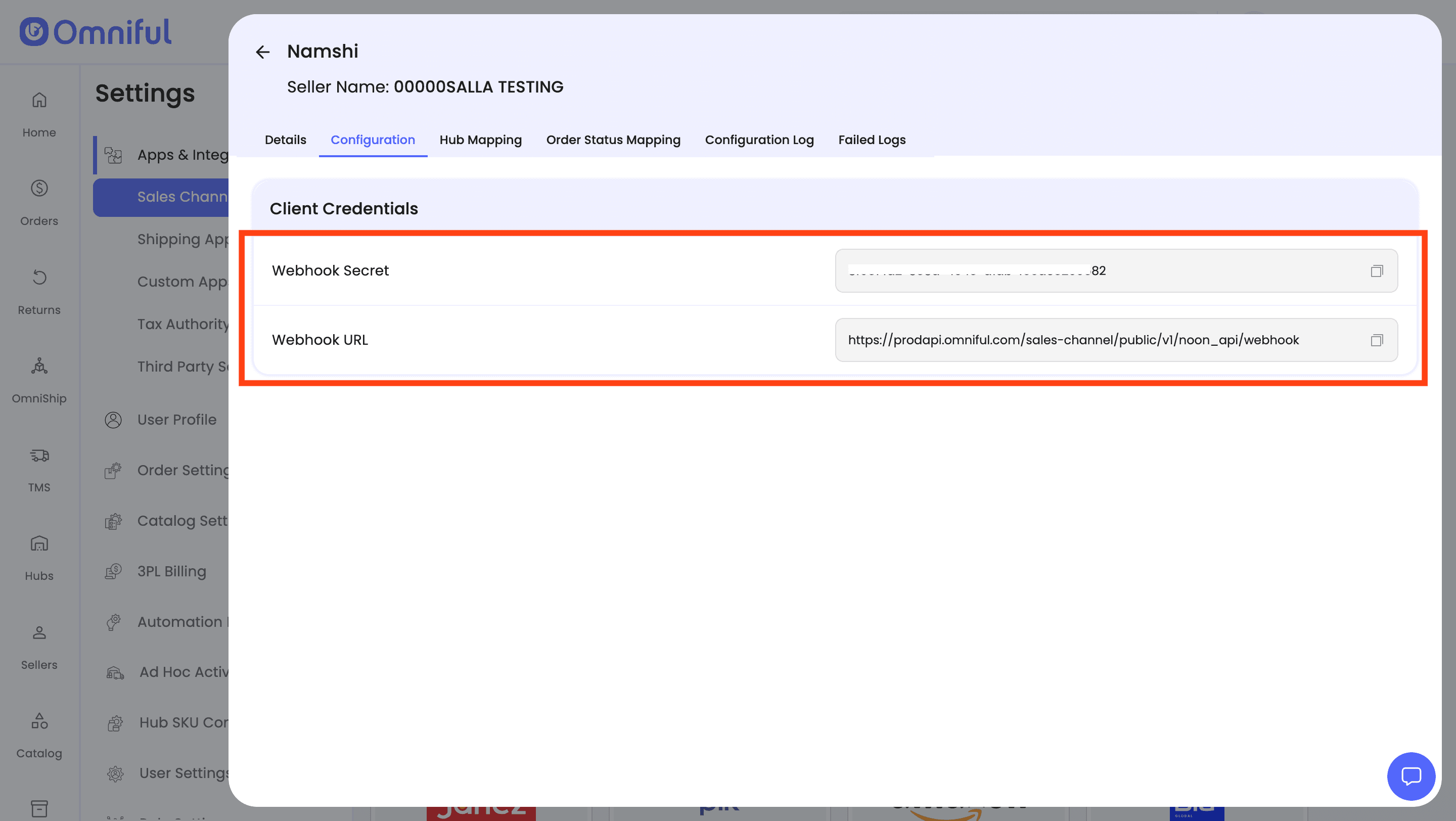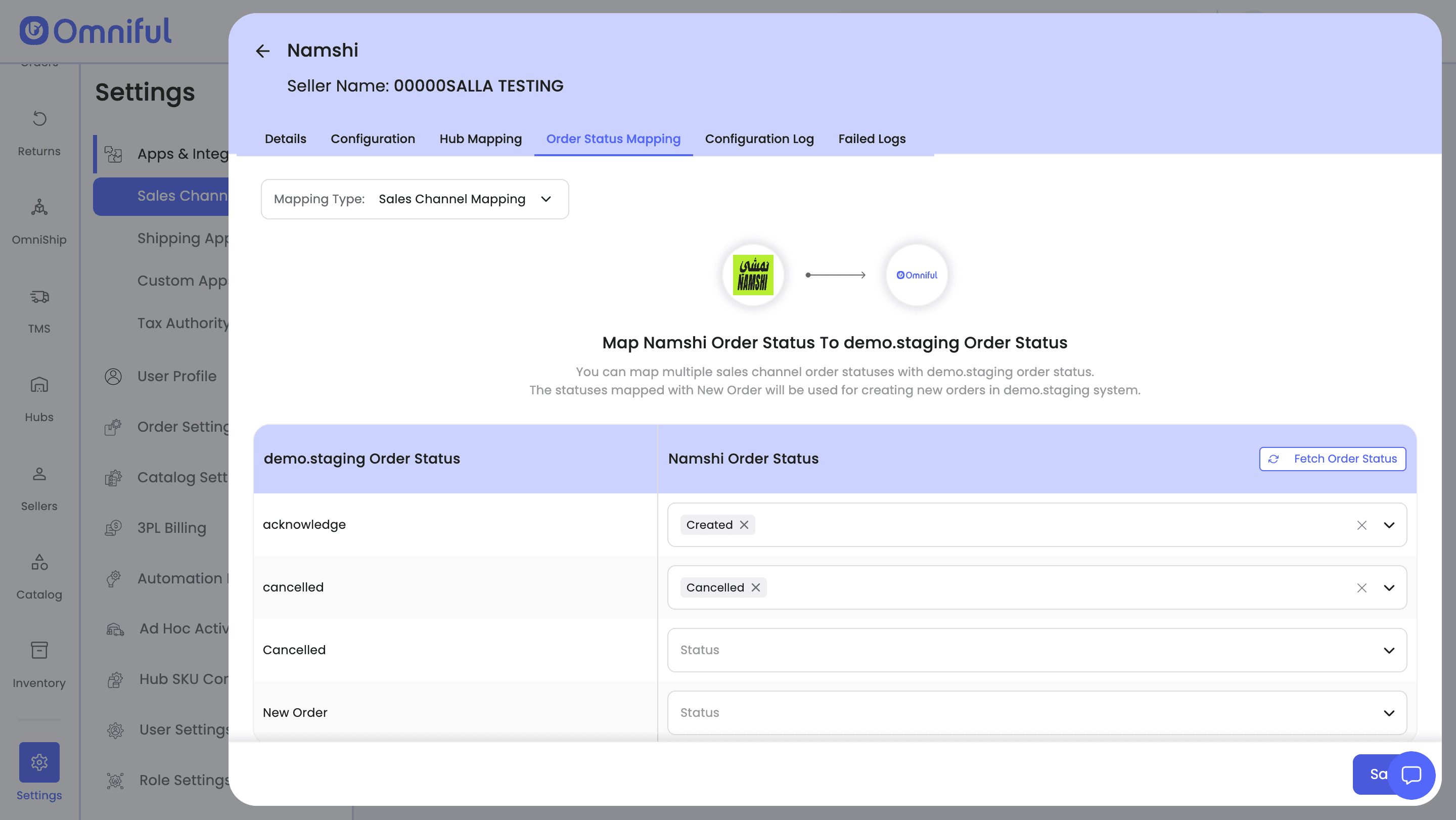 Note: Ensure Namshi order statuses (such as New and Accepted) are configured correctly—otherwise new orders may not sync to Omniful. Likewise, if the cancelled status is not mapped, cancelled orders will not sync back to Namshi.