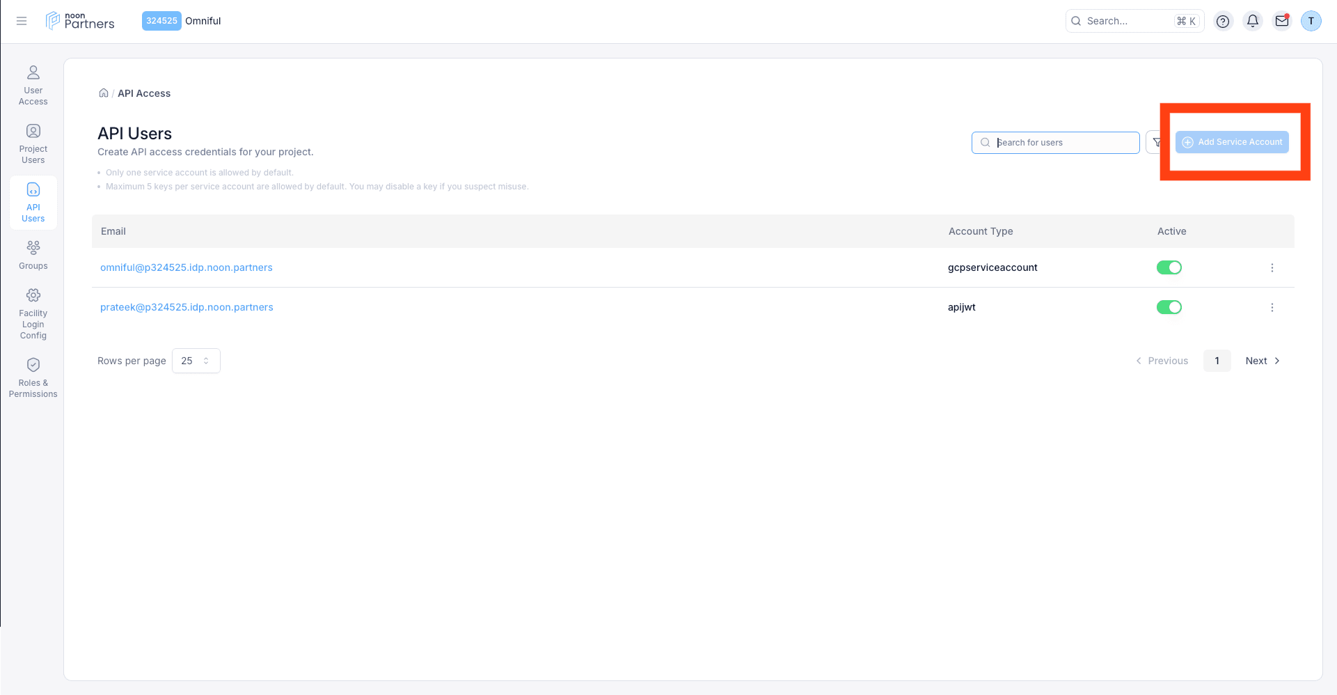 - Add a New Service Account with the Account Type “apijwt” (When creating an API user, always assign the role Project Owner to avoid sync failures.)