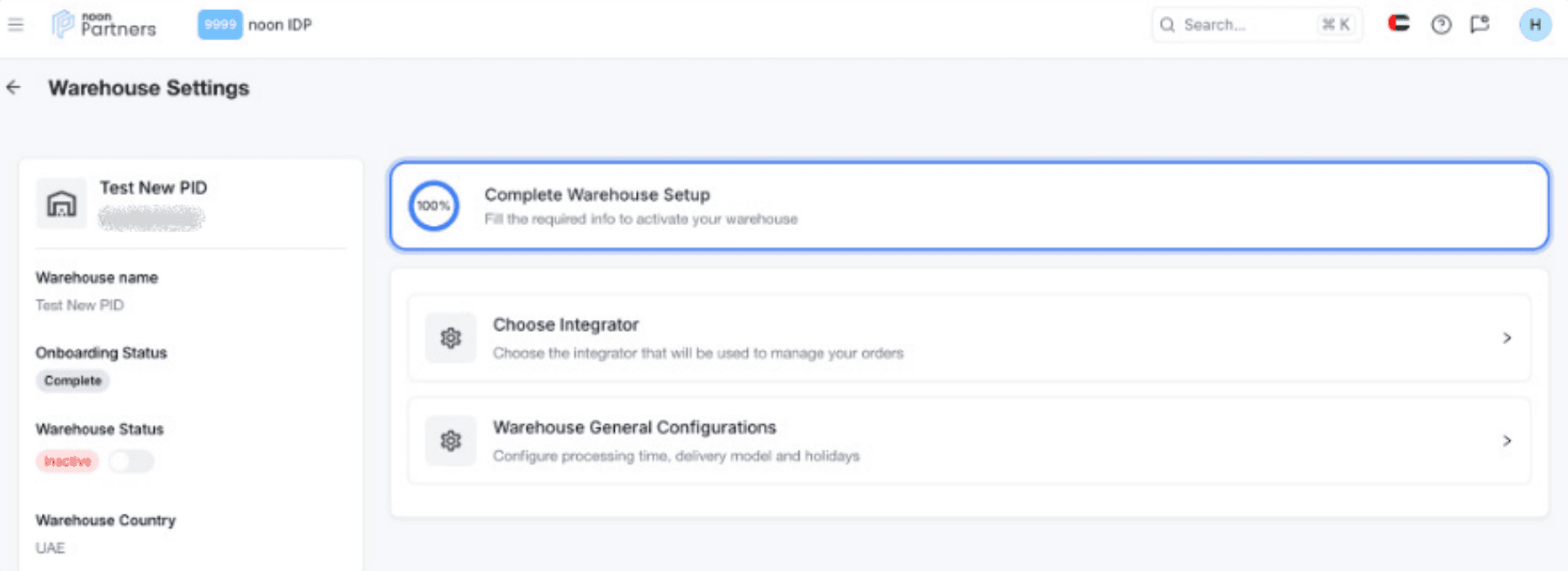 Use the toggle below the warehouse status to set it to Active. The warehouse is now fully configured.