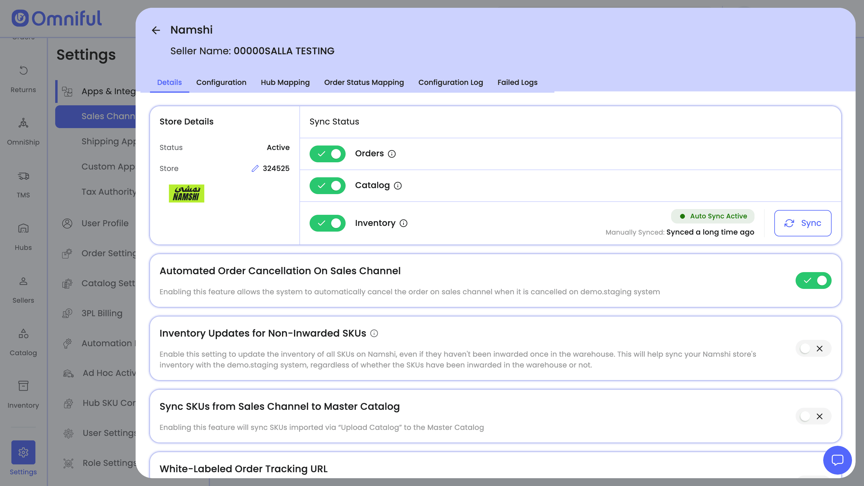 When ‘Automated Order Cancellation On Sales Channel’ is enabled, canceling an order in Omniful triggers an automatic cancellation on Namshi, keeping both systems aligned.