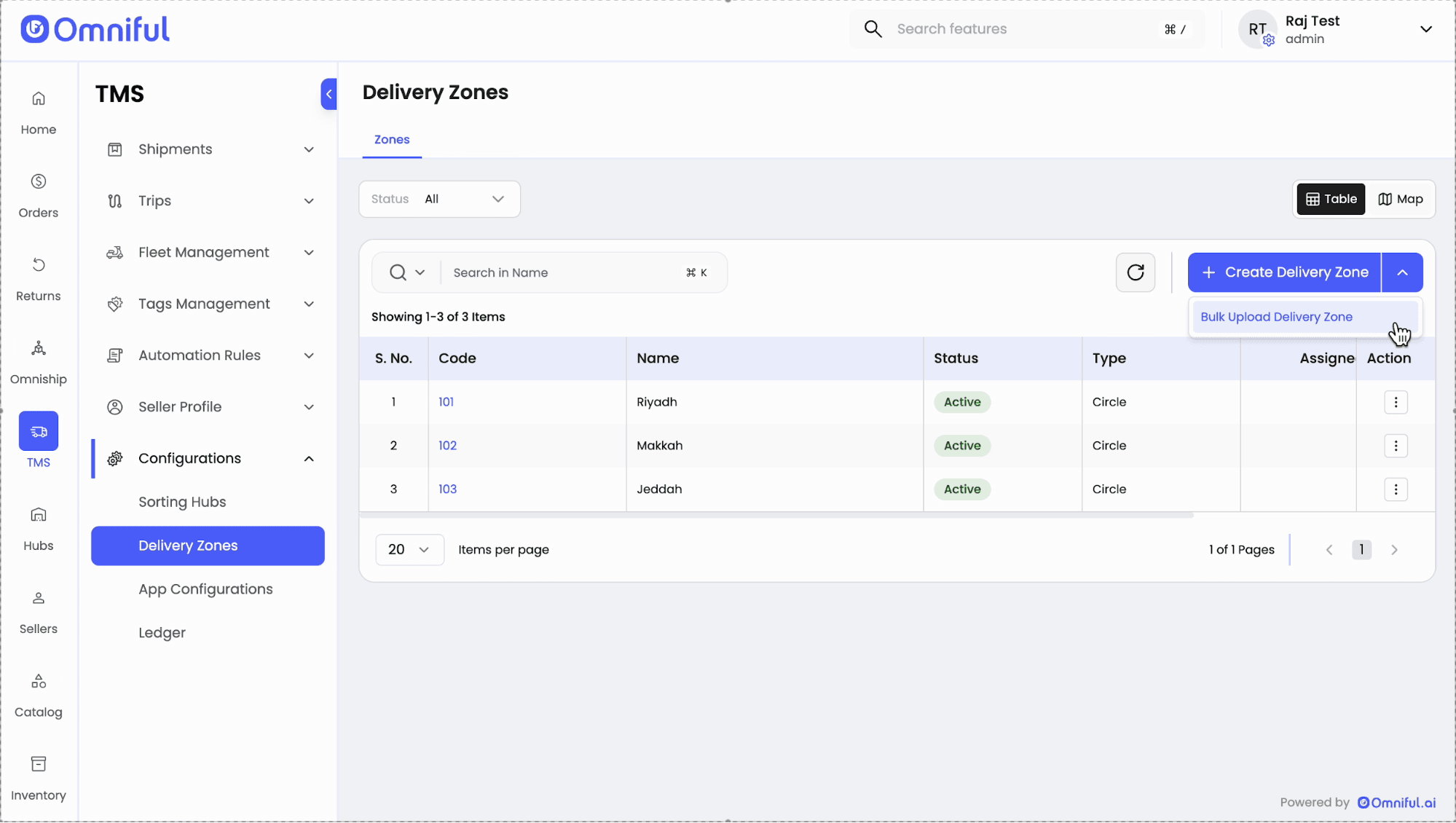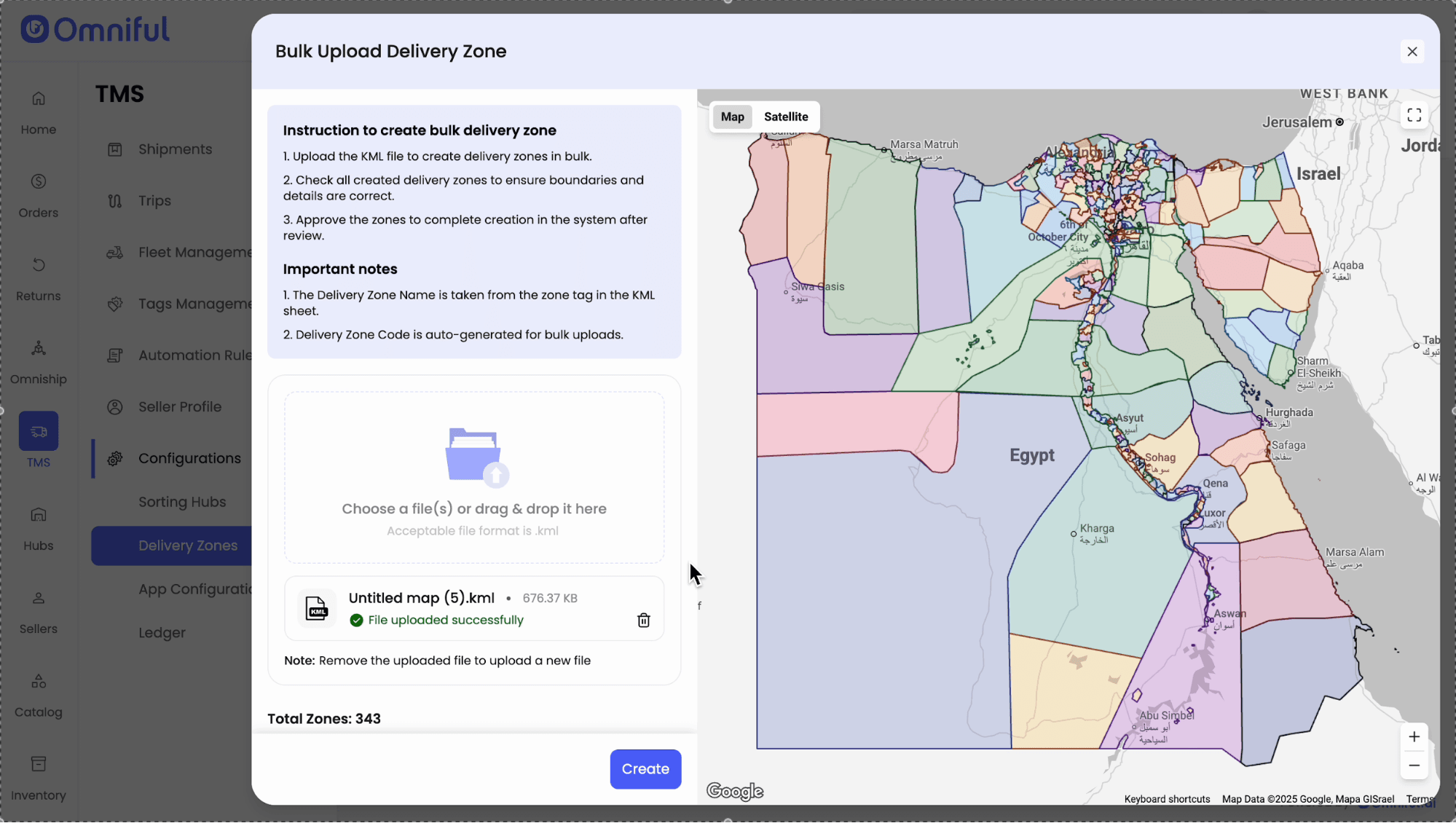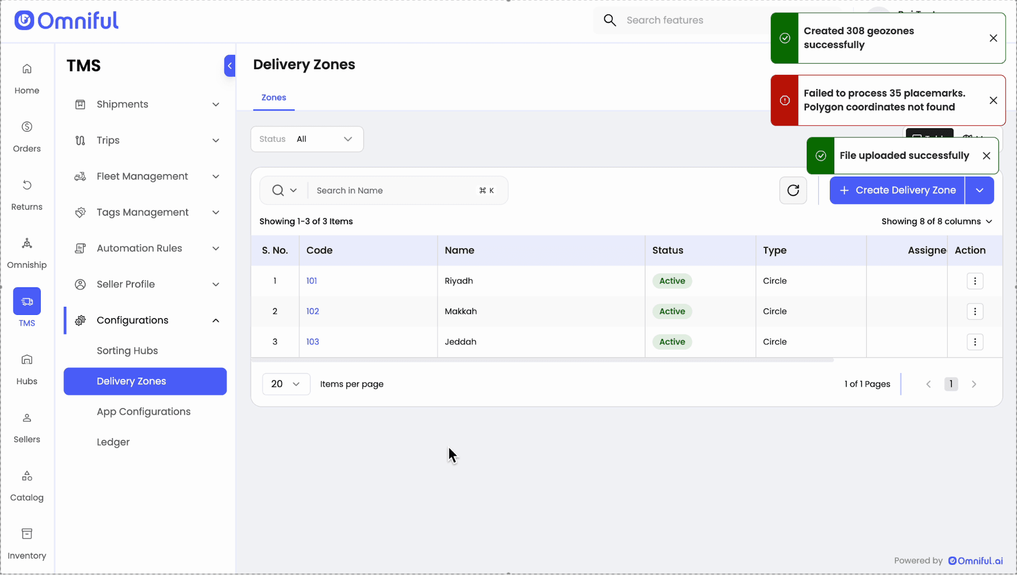Omniful TMS now supports creating delivery zones in bulk by uploading a KML file and updating multiple zones together directly from the Map view.