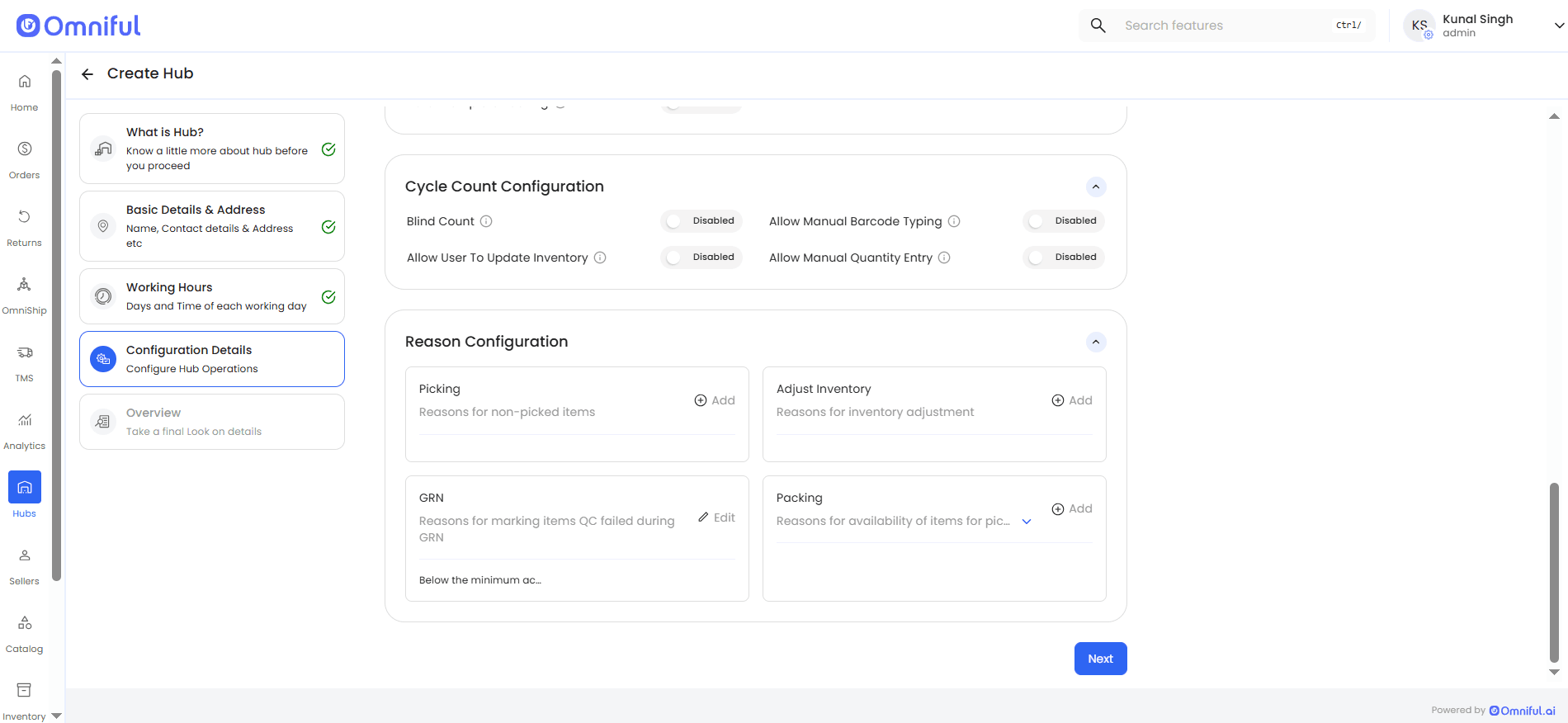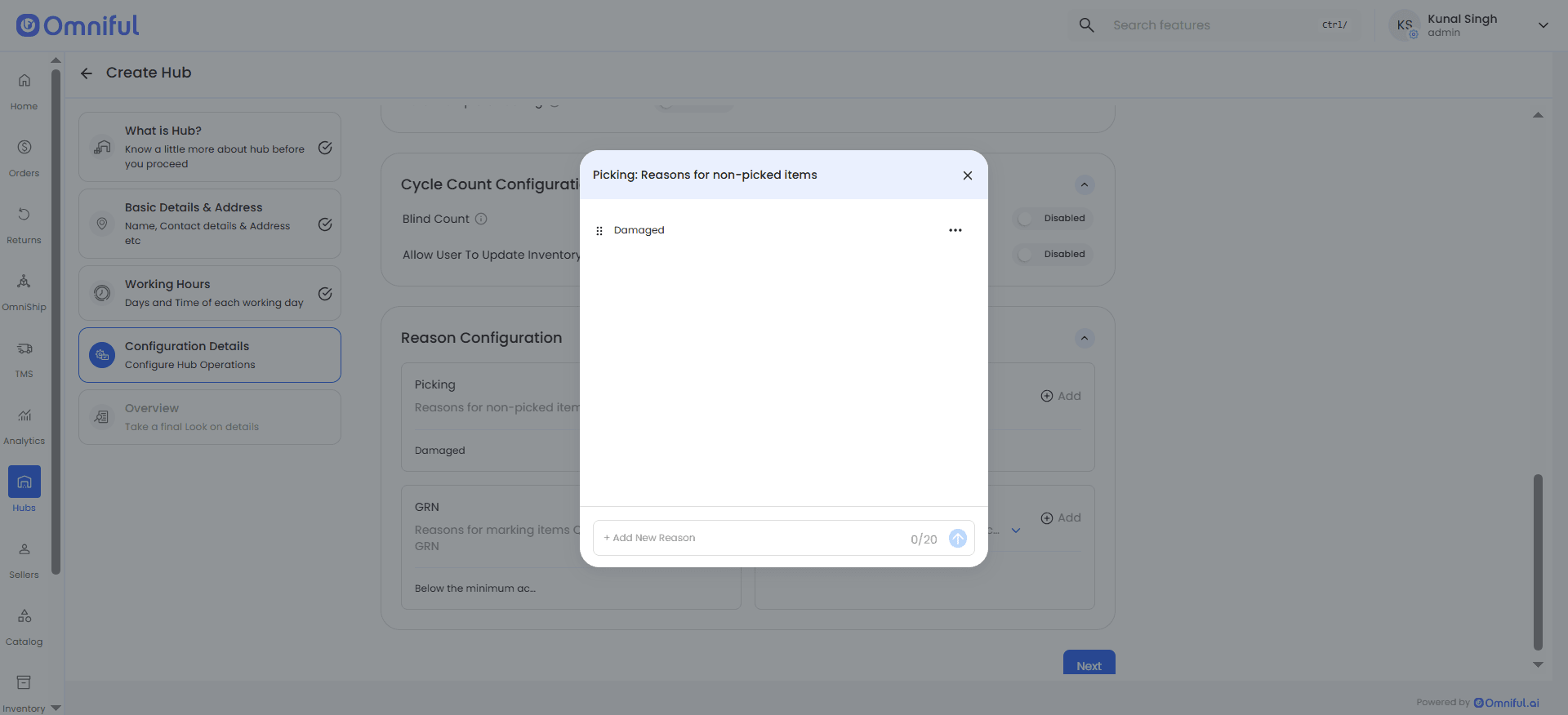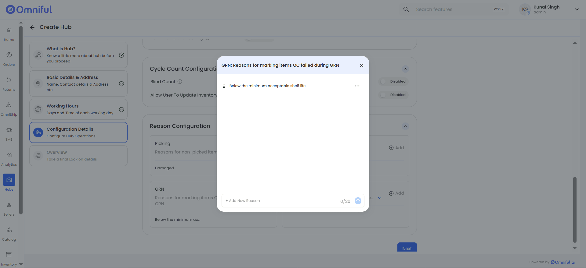 Earlier, reasons were managed at the tenant level and could only be added after creating a hub by editing it. Now, Omniful WMS supports managing reasons at the hub level, allowing users to add, review, and configure them directly during hub creation. Additionally, when a hub is cloned, its reasons are copied to the new hub. This simplifies setup and ensures each hub has reasons relevant to its workflows.