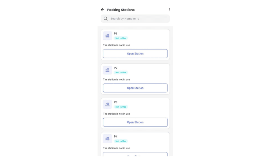 In the Hub Ops app, packers and admins can view all existing packing stations via the Packing Station module.
