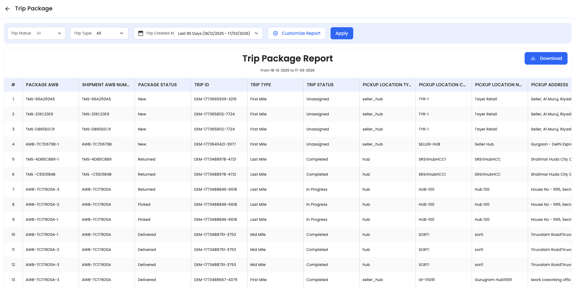 Introduces the TMS Trip Package Report, a real-time operational traceability report that shows how packages are associated with trips across first-mile, middle-mile, last-mile, and hyperlocal movements.