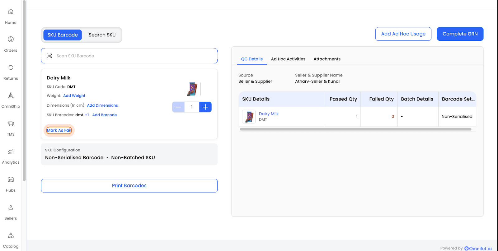 Action: GRN QC screen - Mark As Fail action available on the scanned SKU