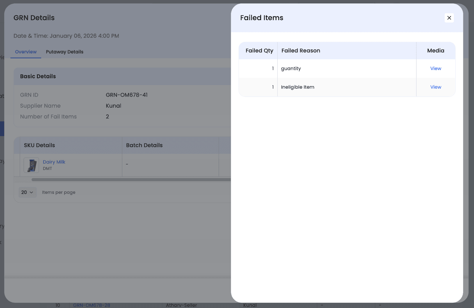 Open GRN Details by selecting the relevant GRN ID. Under Failed SKU Details, click View in the Media column to review reason-wise failed quantities and attached media.