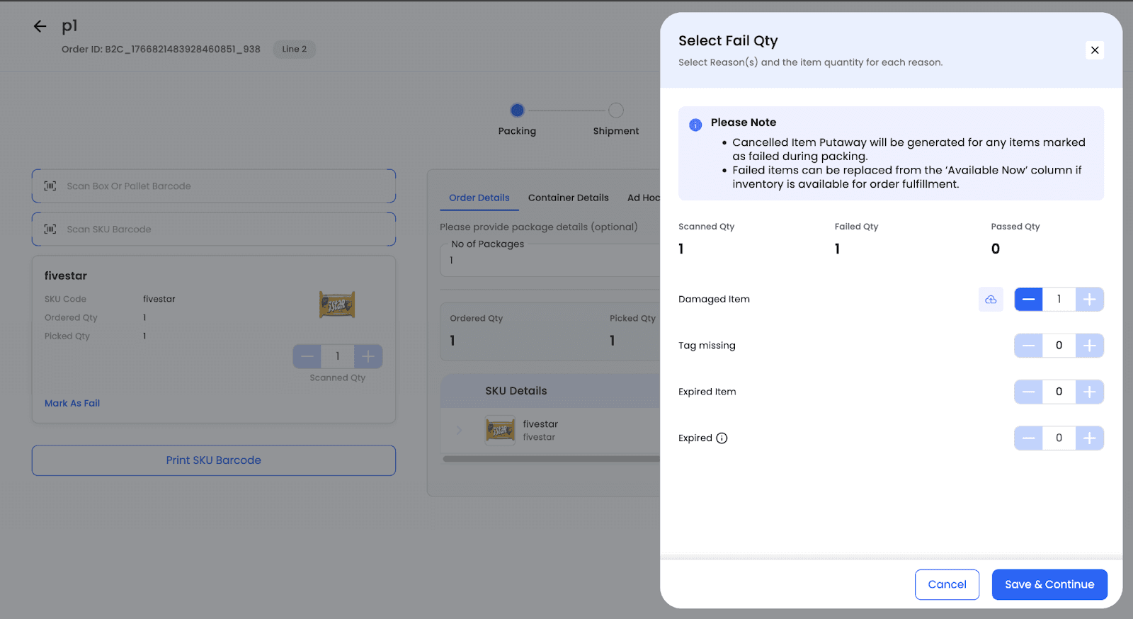 - To fail an item: click Mark As Fail on the SKU card, select failure reasons, set quantities, and upload media.