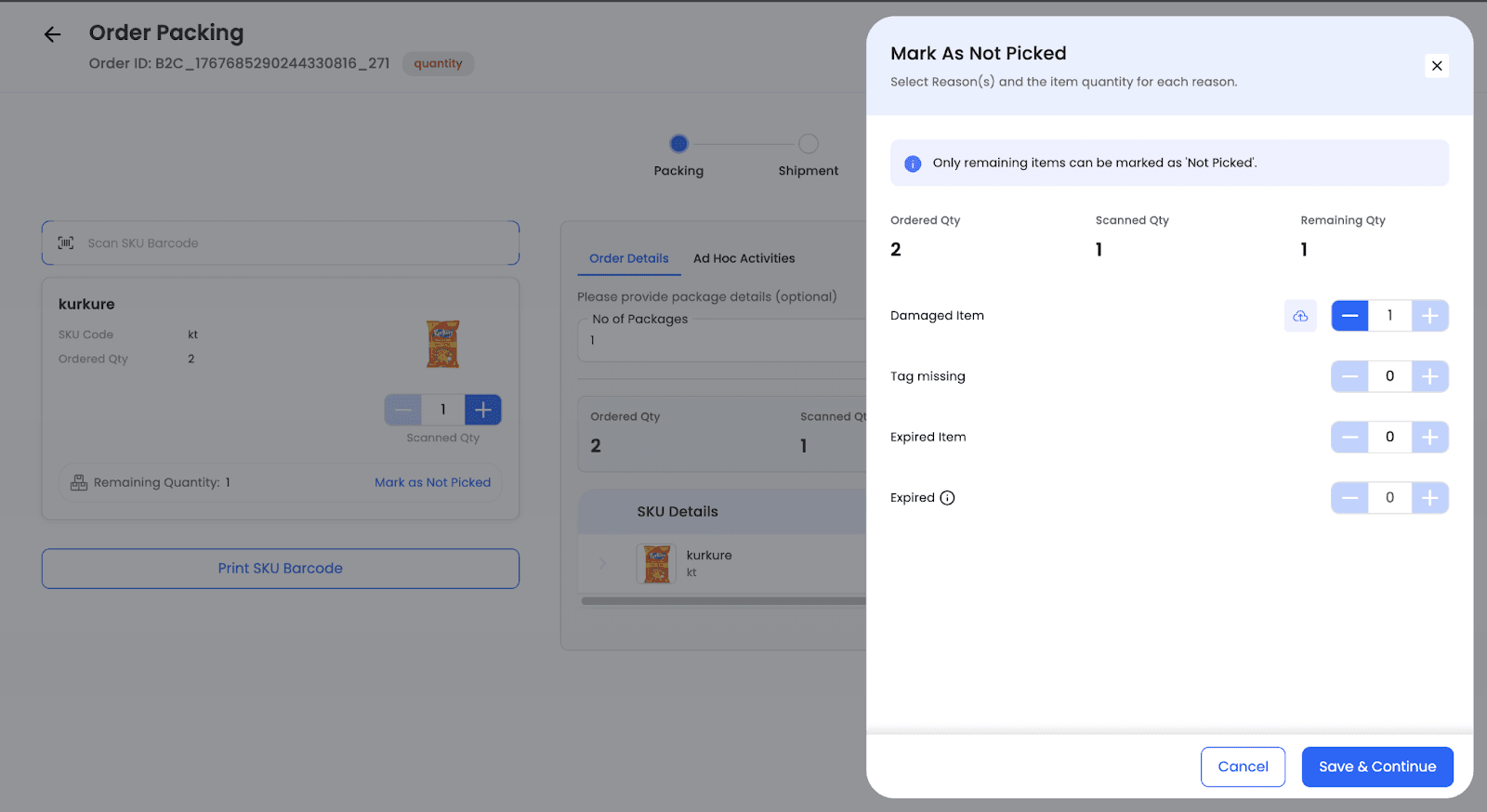 Users can attach media (photos or videos) while marking SKUs as failed during GRN and packing. Media can also be added when marking an SKU as not picked during packing in hubs operating on hub-based inventory tracking with picking disabled.
